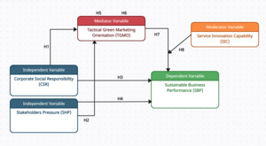 Moreover, creativity has been seen as a interventional and a vital part of firm efficacy (Damanpour, 1991; Najib et al., 2022). The introduction of advanced tech innovation enhances significance and confers a rivalrous advantage. Firms that are implementing green marketing strategies can enhance their worth as a pioneer among stakeholders. Hence, the presence of service innovation capabilities in a firm can potentially attenuate the link between TGMO and SBP. Therefore, the subsequent hypothesis is suggested: