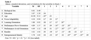 Our research bridges goal orientations and EI literature, examining conditions that influence their relationship. Using a socio-cognitive framework integrating identity perspectives with goal orientations research, we found support for five of our six hypotheses. Goal orientations significantly predicted EI formation, with rurality moderating the LGO–EI and PAGO–EI relationships, but not the PPGO–EI association.