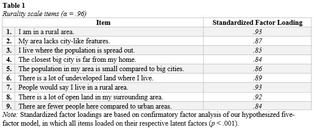 Rurality*.*** In Study 2, we introduced a nine-item self-report scale developed following recommended scale construction procedures (i.e., Colquitt et al., 2019; Hinkin, 1995, 1998). Respondents were asked to rate how much they agreed with statements, on a scale from 1 (Strongly Disagree) to 7 (Strongly Agree), about where they live. Table 1 provides the full list of items, along with the scale’s reliability and standardized factor loadings from Study 2.