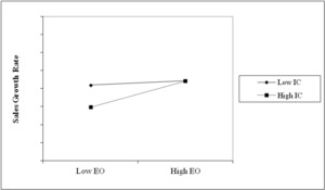 The interaction effects were plotted following the procedure suggested by Cohen et al. (2003). Figure 1 demonstrates that the relationship between EO and sales growth rate in high-tech SMEs is most positive among those firms exhibiting high levels of (i.e., tight) innovation control. Notably, Figure 1 suggests that lower levels of (i.e., loose) innovation control is more conducive to sales growth among the low-EO firms in the sample. Perhaps the general aversion of these more conservative firms to innovation results in the consideration of only narrowly defined sets of growth opportunities. The removal of restrictions to the innovation process via loose innovation controls may minimize the number of “false negative” new product-market initiatives considered by low-EO firms (i.e., the number of promising initiatives that are too quickly redirected or terminated), increasing these firms’ likelihood of realizing rapid growth.