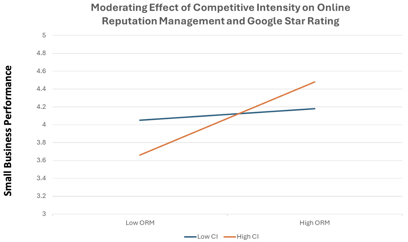 In the model, H1 hypothesized a positive relationship between customer orientation and online reputation management, and the results showed a path coefficient of (β = 0.14, p = 0.013) in support of H1. Additionally, Internet self-efficacy had a positive effect on online reputation management (β = 0.50, p < 0.001), validating H2. H3 hypothesized that online reputation management (ORM) has a positive effect on small business performance. The results support this hypothesis with a significant path coefficient (β = 0.53, p < 0.001). H4 posited a positive effect of ORM on Google Star ratings. The analysis revealed a significant positive relationship (β = 0.32, p < 0.001), supporting H4. To examine the contextual factors of the competitive environment, H5a evaluated the moderating effect of competitive intensity on the relationship between ORM and Google star rating. The results indicate that competitive intensity significantly moderates this relationship (β = 0.22, p < 0.001). Specifically, in more competitive markets, ORM practices lead to higher Google star ratings. Hypothesis H5b proposed that the interaction between competitive intensity and ORM would positively influence small business performance. The findings indicate that competitive intensity significantly moderates this relationship (β = 0.31, p < 0.001), supporting H5b. Finally, H6 proposes that Google Star ratings have a positive effect on small business performance. The results do not support our hypothesis, showing an insignificant effect (β = 0.01, p = 0.56). See Figures 2 and 3 for graphs of the moderating effects. The model offers a substantial explanation for the variance in the endogenous variables of ORM, Google Star ratings, and small business performance. Customer orientation and Internet self-efficacy explained 44% of the variance in online reputation management. Online reputation management explained 35% of the variance in small business performance and 9% of the variance in Google Star ratings. The results of the model are listed in Table 3.