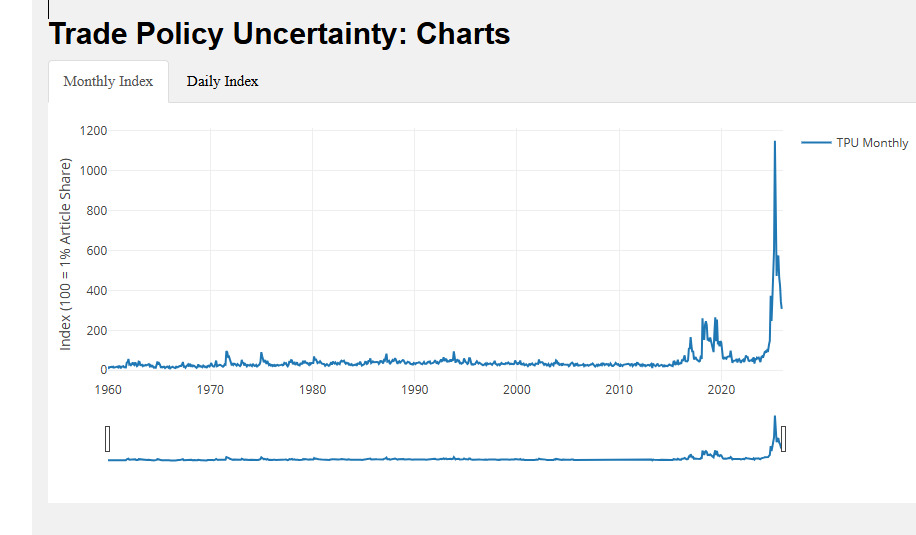 The TPU index is based on searches of the archives of seven newspapers: The Boston Globe, The Chicago Tribune, The Guardian, The Los Angeles Times, The New York Times, The Wall Street Journal, and The Washington Post. The measure is calculated by counting the monthly frequency of articles discussing trade policy uncertainty (as a share of the total number of news articles) for each newspaper. The index is then normalized to 100 for a one-percent article share. The TPU Index starts in 1960. https://www.matteoiacoviello.com/tpu.htm