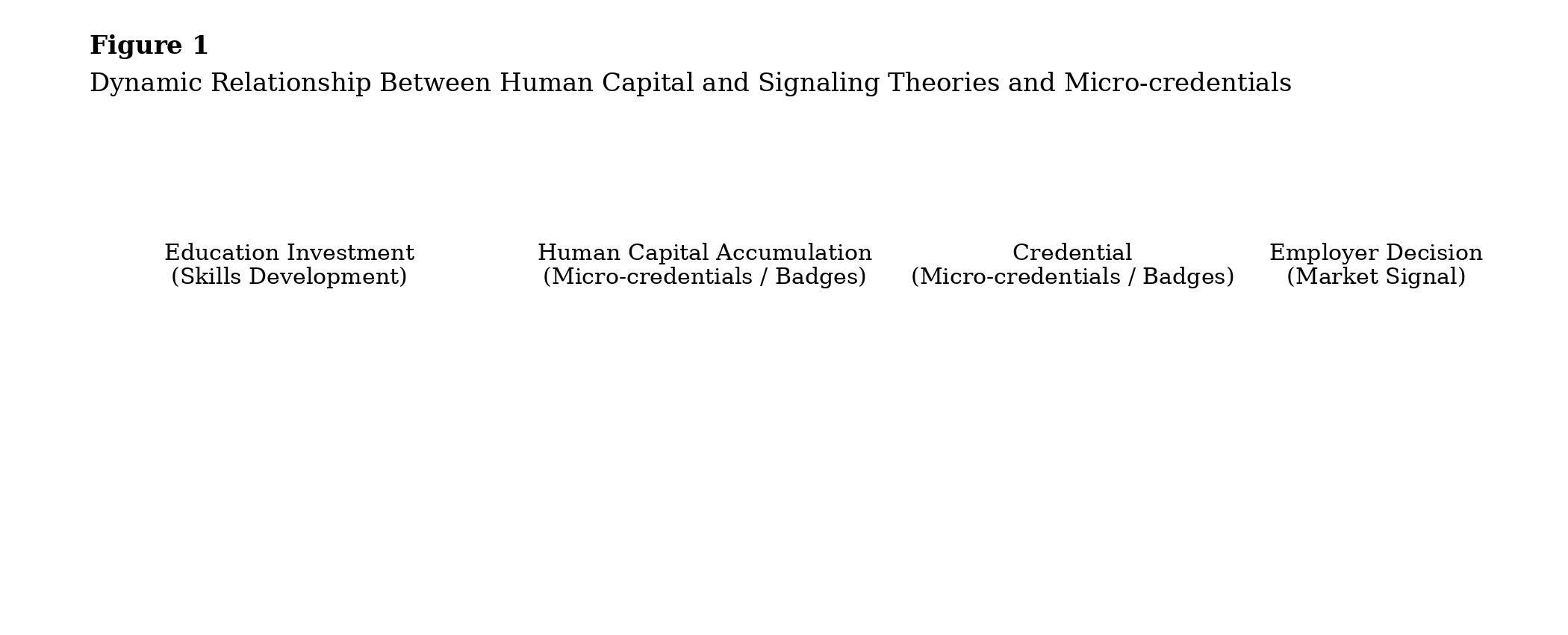 Together, HCT and ST may explain the emergence and adoption of micro-credentialing and digital badging in higher education and workforce development. Figure 1 illustrates our conceptualization of the dynamic and interdependent relationship between HCT and ST. Education investments lead to human capital accumulation, which is operationalized through MCs and DBs. These credentials function as industry-aligned signals that reduce information asymmetry and hiring risk, particularly for SMEs, thereby shaping employer decision-making.