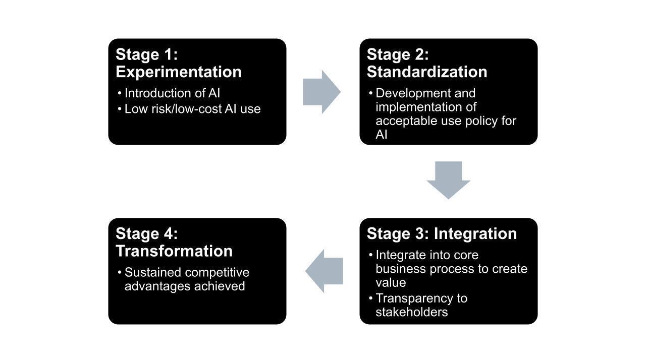 Stage 2 - Standardization: After moving beyond the initiation and experimentation stage, organizations are urged to begin standardizing the use of AI. Initial standardization can be achieved by developing and implementing an acceptable use policy that clearly specifies which AI tools may be used, for what purposes, and who is responsible for oversight and enforcement. Small businesses should transition from free tool versions to low-cost “pro” versions and use them for higher-value tasks. Resource capabilities are developed for the organization through formal policies on AI use. Stakeholders are also better protected by implementing this governance framework. For example, small manufacturers can use sensors to collect data and store it in databases. Then, AI models help detect patterns and automate routine analytics, creating a foundation for repeatable and scalable solutions. Additionally, a policy manual for AI processes is developed and shared across organizations, and responsible managers should regularly review and monitor these processes to ensure compliance (Nolan, 1979; Wade & Hulland, 2004).