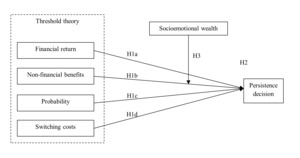 According to threshold theory, persistence is influenced by the attractiveness of alternatives which includes four decision attributes: (1) expected financial returns, (2) expected non-financial benefits, (3) probability of expected outcomes, and (4) expected switching costs (Gimeno et al., 1997). This study is consistent with prior research with regards to defining and operationalizing each attribute (Holland & Shepherd, 2013; Ma et al., 2019). Expected financial returns refer to the monetary gains derived from owning the business. Expected non-financial benefits refer to the non-monetary benefits of owning the business, such as recognition, autonomy, and family security. Expected switching costs refer to the expected financial or non-financial costs of switching from one venture to another, such as effort, resources, and time expended while finding another opportunity. The probability of expected outcomes refers to the likelihood of achieving the outcomes associated with the other three attributes. These attributes can be conceptualized into three categories: monetary, non-pecuniary, and uncertainty. Expected financial returns and expected switching costs fall into the monetary category, expected non-financial benefits fit in the non-pecuniary category, and the probability of expected outcomes represents uncertainty.